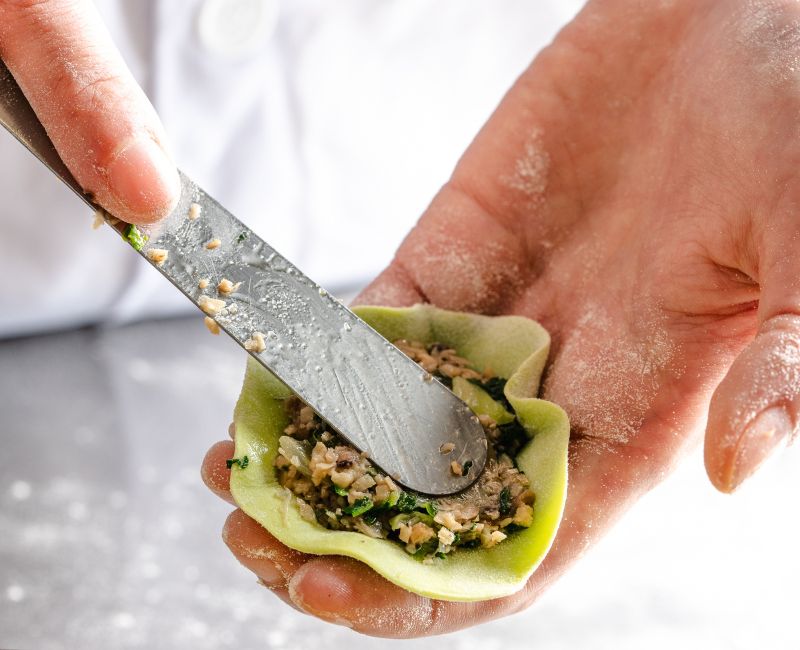 Qui la differenza la fa la mano: la sfoglia sottile abbraccia il ripieno e le pieghe, chiuse una a una, tengono umidità e forma in cottura.